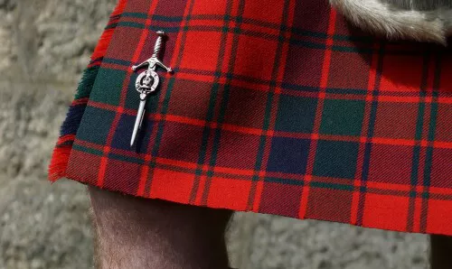 A kilt pin has been worn with kilts since Queen Victoria used a hat pin to secure a soldier's kilt on a windy day. This tradition allows you to wear a pin of your liking, and the only rule is that it should be worn on the right side of your kilt and pinned only through the front apron to stop any sort of tearing. It needs to sit about four inches from the bottom of the kilt as well as around two inches from the fringe.